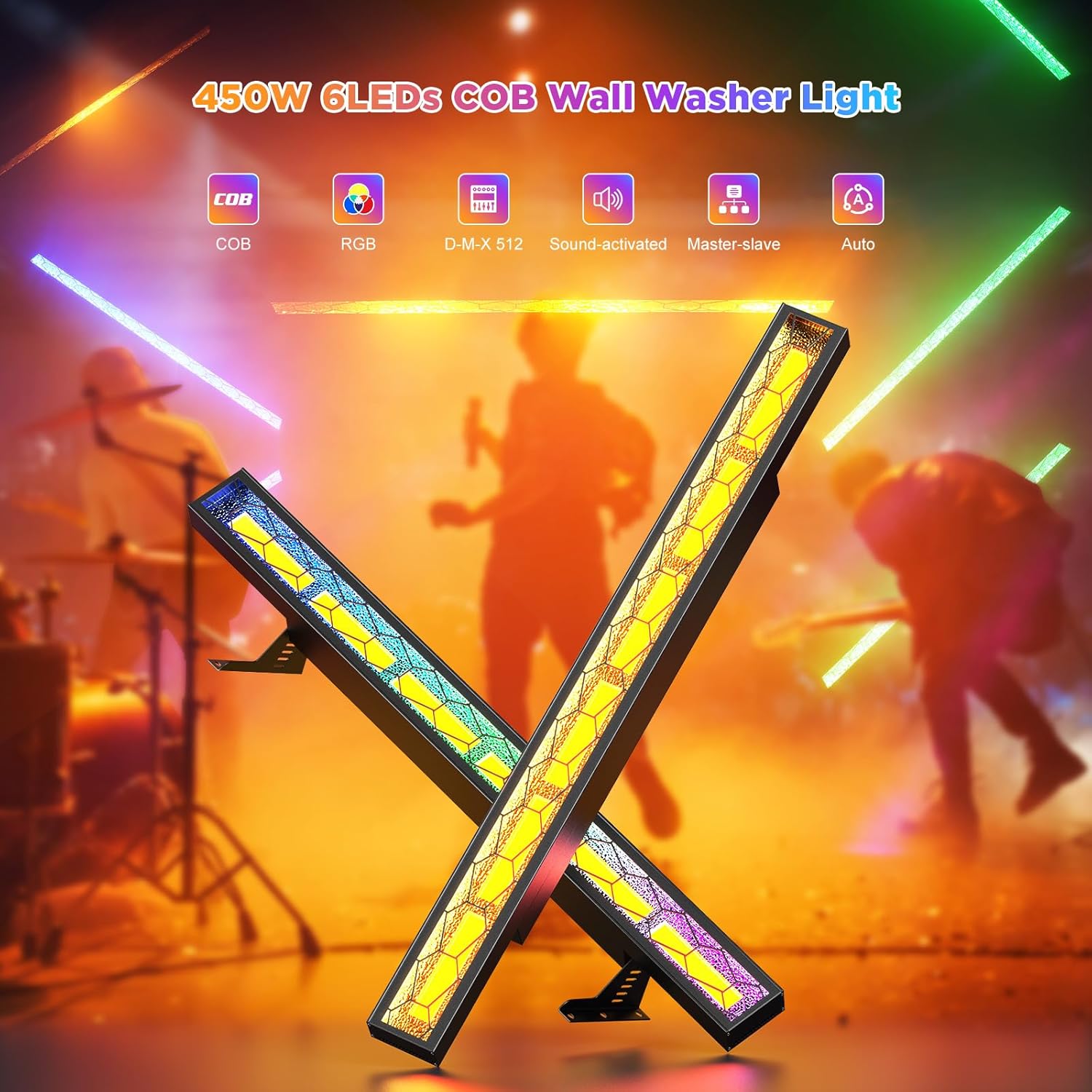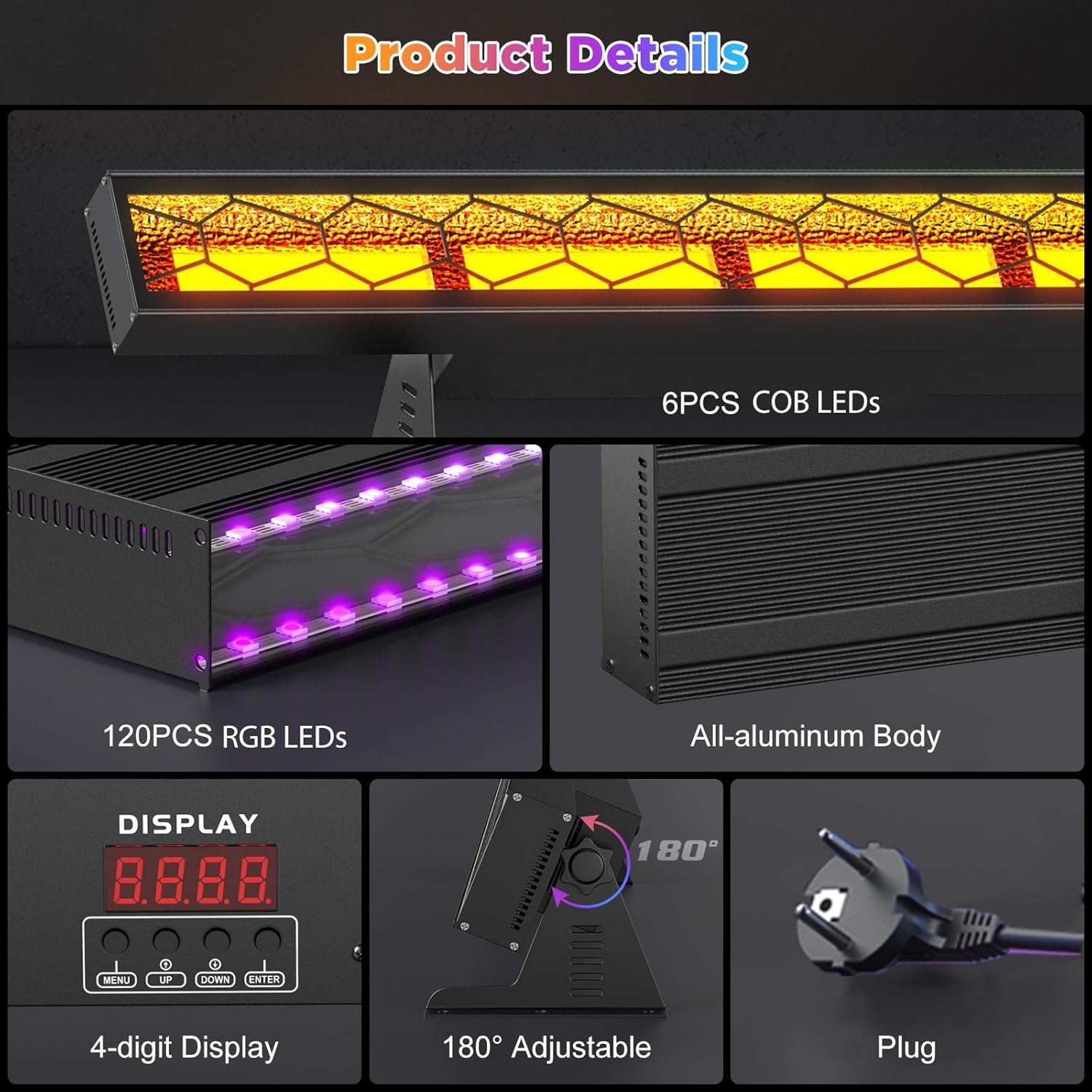 【LED Bar Effect】By 6pcs x 75W COB amber as the main light, high brightness, uniform light effect, support the controller to precisely control each LED light source, plus with 120pcs- full color RGB as the auxiliary light, can be monochrome or color mixing variations, to create a dream and bright dynamic lighting effects, to meet the needs of a variety of performances.